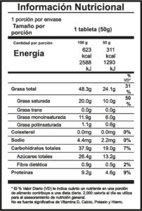 Pasta de cacao, manteca de cacao, panela orgánica y castaña pelada deshidratada.